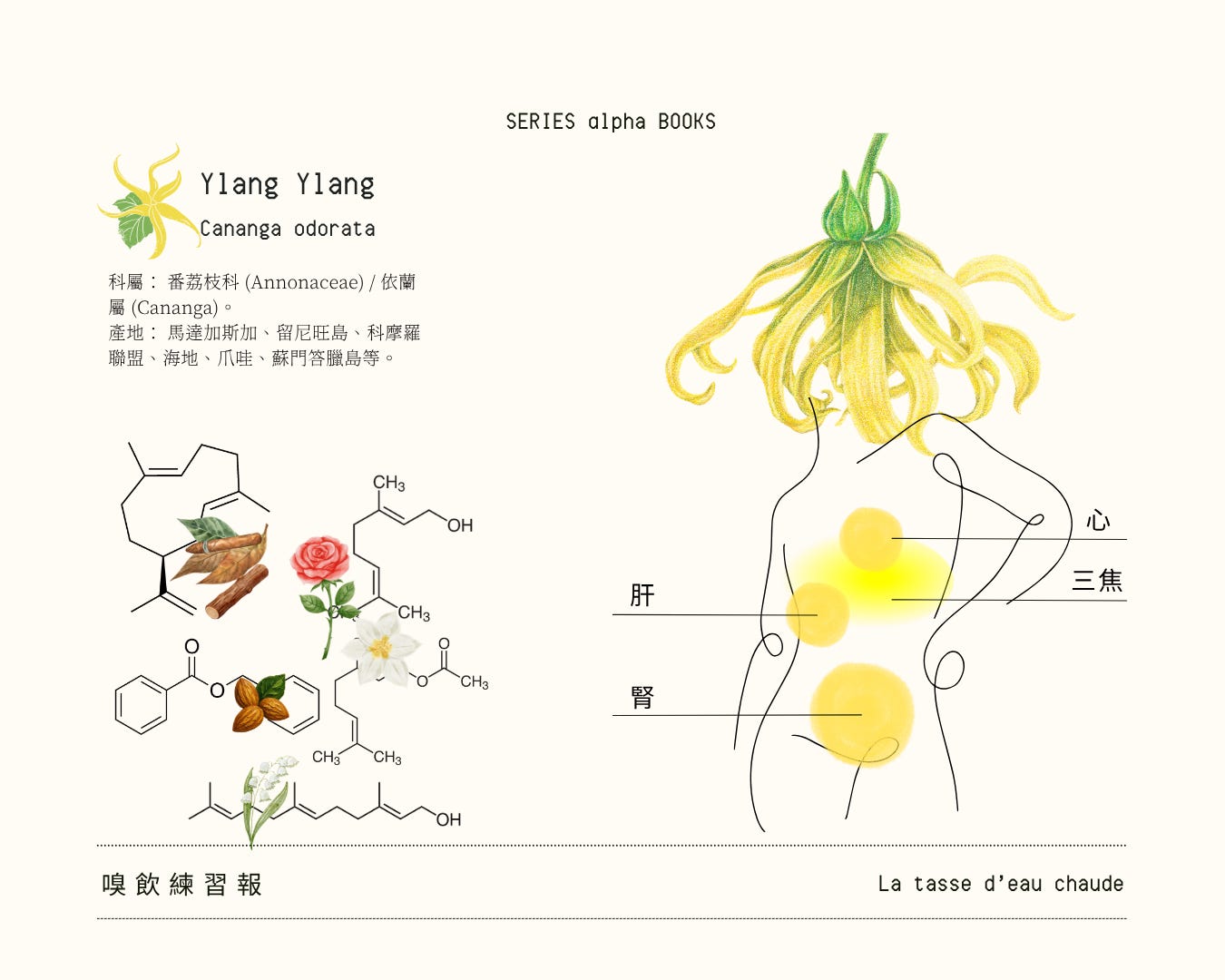 原生於東南亞的依蘭生了一副帶點張狂感的花瓣,據說野生依蘭能長到三十公尺高(真是驚人的存在感)。閱讀她的分子履歷非常豐富,是一款具備了前中後調的精油,有著「香水樹」之稱。嗅聞依蘭精油不可過近,因為氣味多半集中在中後調的大分子,帶著厚重甜膩彷彿杏仁茶混合各類玫瑰、茉莉濃郁花香氣的牻牛兒醇、苯基酯、乙酸牻牛兒酯等,太湊近聞可能會有如重鎚出擊般的受驚,但這股強烈張狂的花香,正帶著強力鎮靜的能力,直接解放我們緊繃的神經;揉雜其間較清寡的是帶著甘草與菸草香的大根老鶴草烯、有著溫暖丁香味的β-丁香油烴,間接誘發神經系統掌管血清素的訊息傳導物質;帶來熱帶香料辛香的醚類分子,擁有抗平滑肌痙攣的能力;還有一抹屬倍半萜醇中的金合歡醇,靜靜散放迷人的2鈴蘭花香。